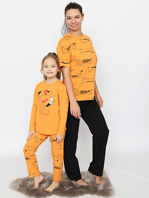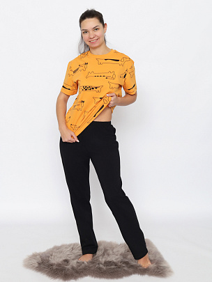 Комбинированная пижама из футболки и брюк. Футболка набивная, небольшого объёма, длиной до линии бёдер, с коротким рукавом. Горловина обработана притачной бейкой из рибаны с лайкрой. Прямые брюки умеренного объёма выполнены из гладкокрашеного полотна. Цельнокроенный пояс обработан плоским швом вподгибку с одновременным прокладыванием резинки.
