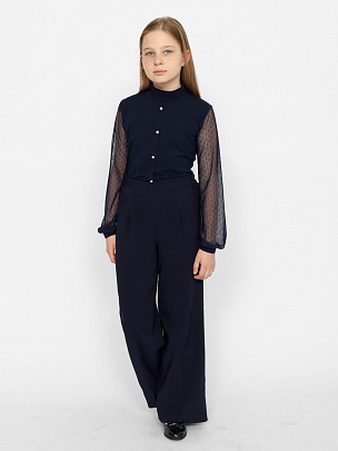 Водолазка для девочки с длинными рукавами и воротником-стойкой. Рукава из сетки с манжетами из кулирки. Полочка с имитацией застежки на пуговицы.