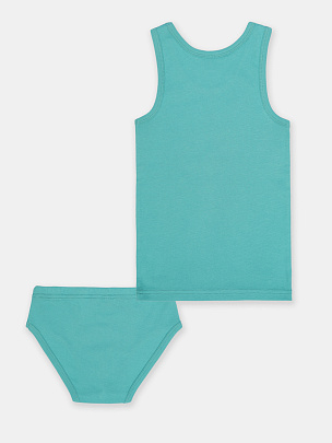 Гладкокрашенный комплект, выполненный полностью в одном цвете. Горловина и проймы майки окантованы бейкой из основного полотна. Перед оформлен шелкографией. Верх трусов обработан плоским швом вподгибку с одновременным прокладыванием резинки. Проймы ножек окантованы бейкой из основного полотна.